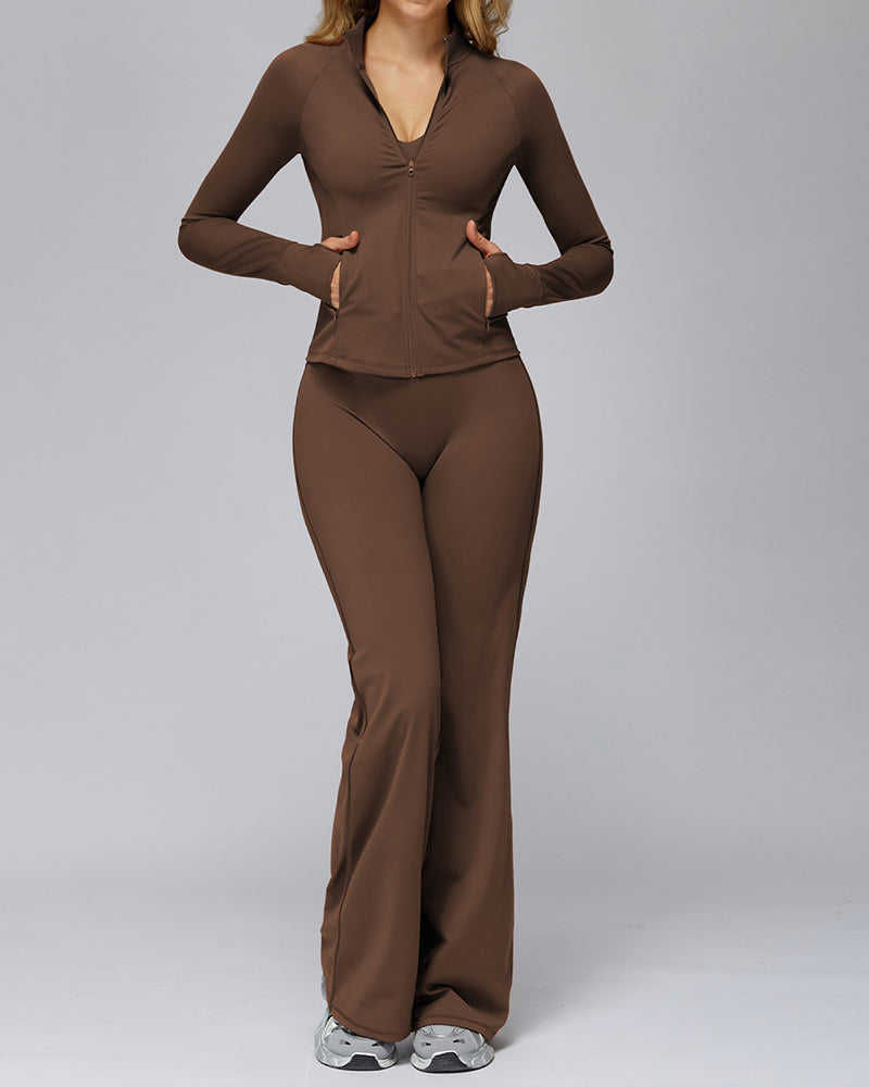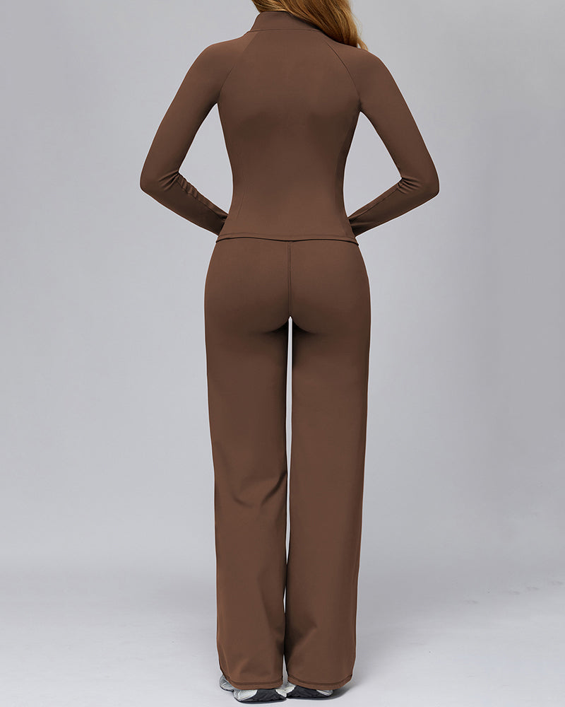 Women Long Sleeve Coat Wide Leg Pants Yoga Two-piece Sets S-XL