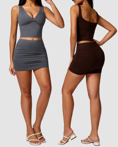 Women V Neck Sports Vest Slim Running Skirts Yoga Two-piece Set S-XL