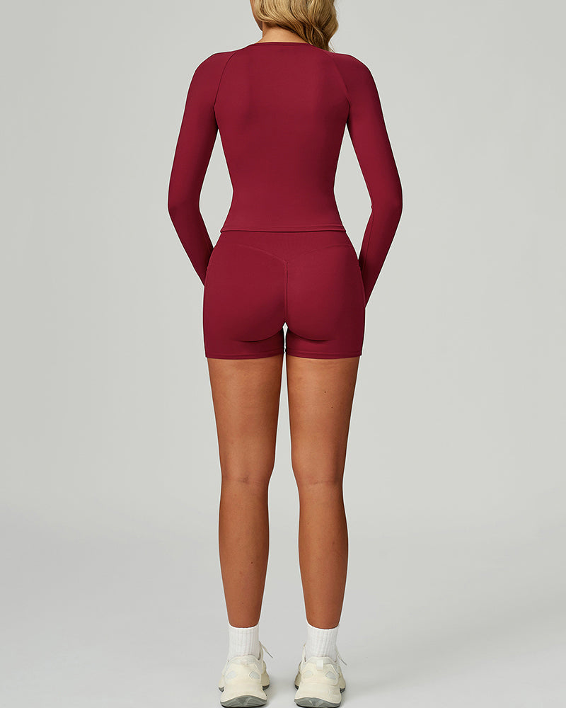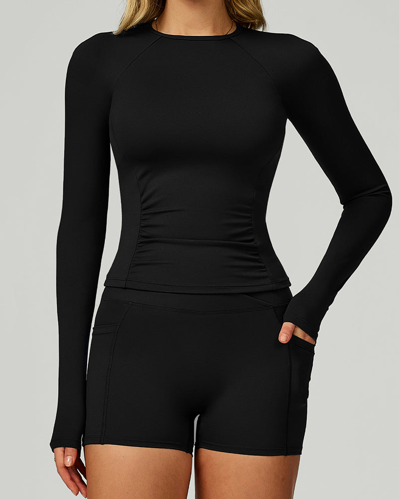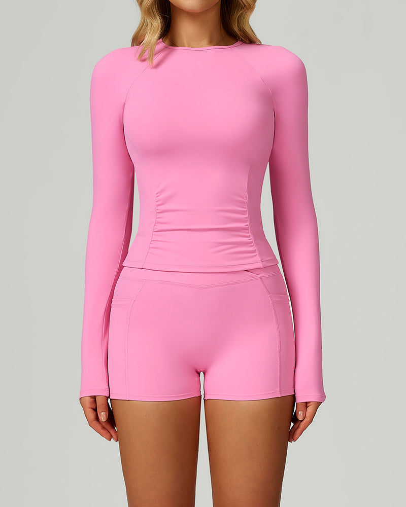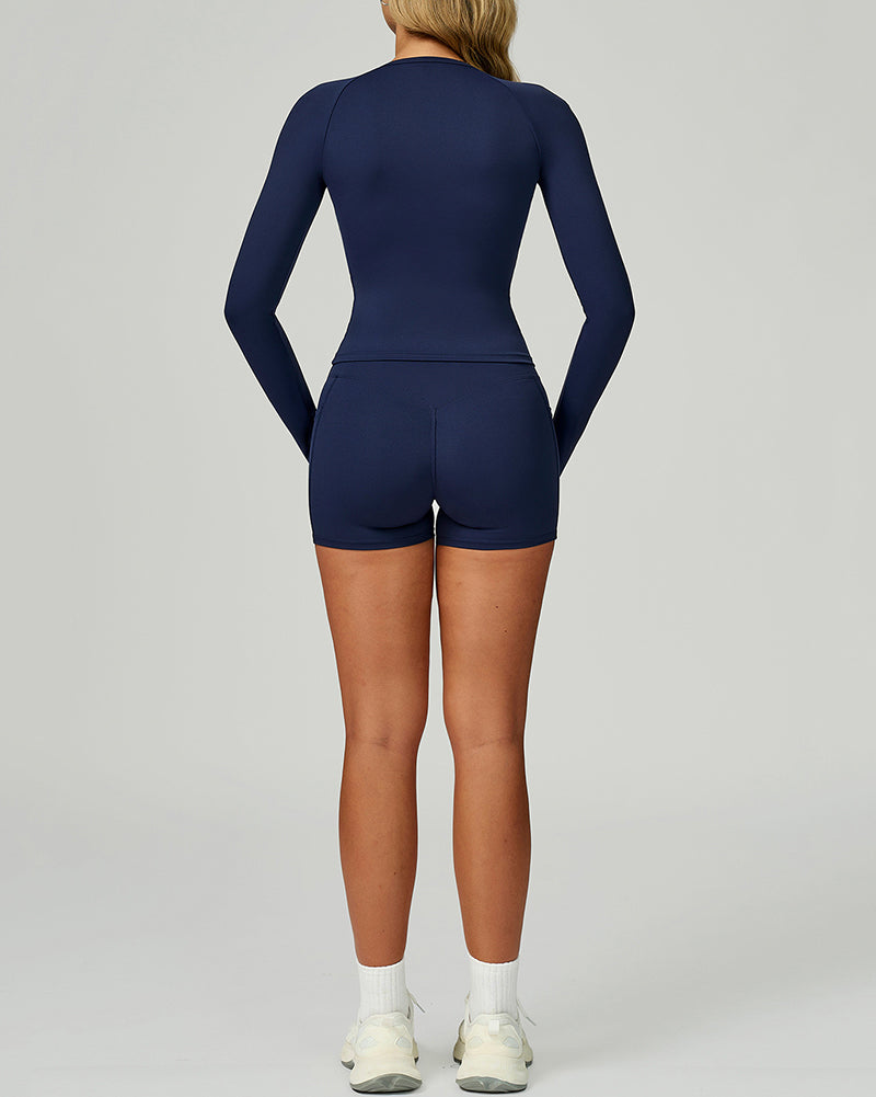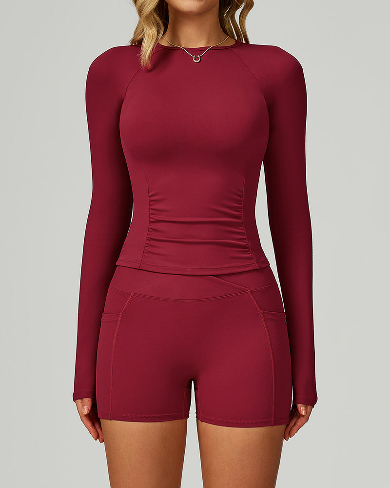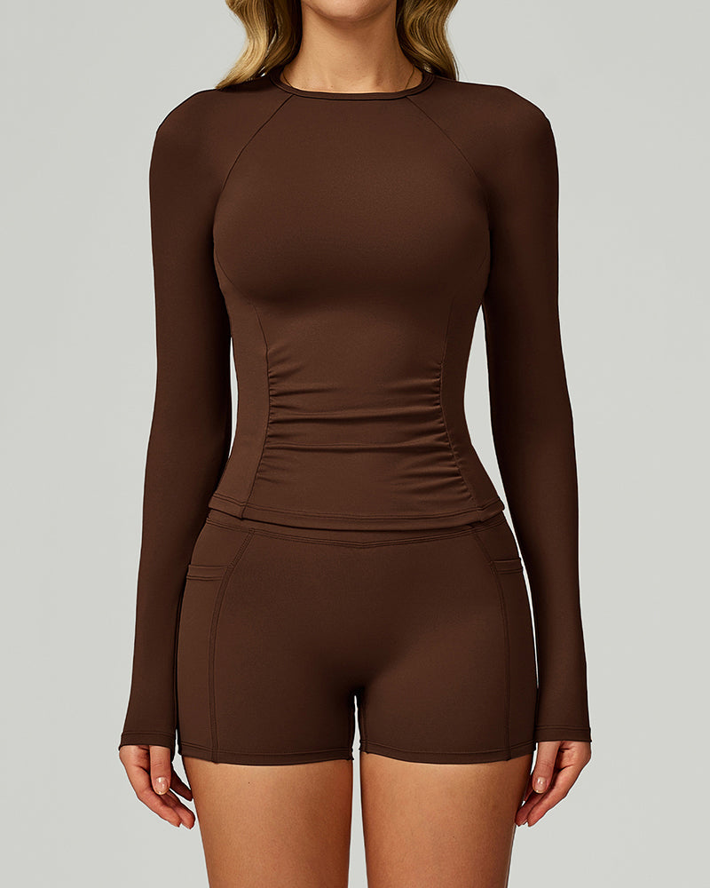 Woman OEM Long Sleeve Slim GYM T-shirt Side Pocket Shorts Yoga Two-piece Sets S-XL